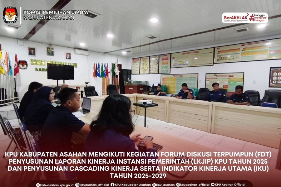 KPU Kabupaten Asahan Mengikuti Kegiatan Forum Diskusi Terpumpun (FDT) Penyusunan Laporan Kinerja Instansi Pemerintah (LKjiP) KPU Tahun 2025 Dan Penyusunan Cascading Kinerja Serta Indikator Kinerja Utama (IKU) Tahun 2025-2029, Selasa(27/01/26). Kegiatan yang diselenggarakan oleh KPU RI ini dihadiri oleh KPU Provinsi/KIP Aceh dan KPU/KIP Kabupaten/Kota se-Indonesia secara daring melalui Zoom Meeting. Dari KPU Kabupaten Asahan diikuti oleh Sekretaris KPU Kabupaten Asahan Ery Dermawan, Kasubbag KPU Kabupaten Asahan Sri Elkaida Harahap dan H.P.Harahap, Fungsional Ahli Pertama KPU Kabupaten Asahan dan Staf KPU Kabupaten Asahan. Narasumber yang dihadirkan diantaranya dari Kementerian PPN/Bappenas dan Kementerian PANRB yang membahas terkait Bimtek Persiapan Penyusunan Laporan Kinerja Instansi Pemerintah (LKjiP) KPU Tahun 2025 dan Bimtek Persiapan Penyusunan Cascading Kinerja dan Indikator Kinerja Utama (IKU) KPU, KPU Provinsi dan KPU Kabupaten/Kota. Tujuan dari kegiatan ini yaitu untuk memastikan akuntabilitas dan transparansi kinerja KPU, menyelaraskan tujuan strategis hingga seluruh unit kerja, menyediakan indikator kinerja yang terukur dan objektif, serta menjadi dasar evaluasi dan perbaikan berkelanjutan guna meningkatkan kualitas penyelenggaraan pemilu dan menjaga kepercayaan publik. Melalui forum diskusi ini, KPU Kabupaten Asahan bersama seluruh KPU di Indonesia telah membuka ruang kolaboratif untuk menyamakan persepsi dan memperkuat komitmen dalam penyusunan dokumen kinerja yang berkualitas. ....