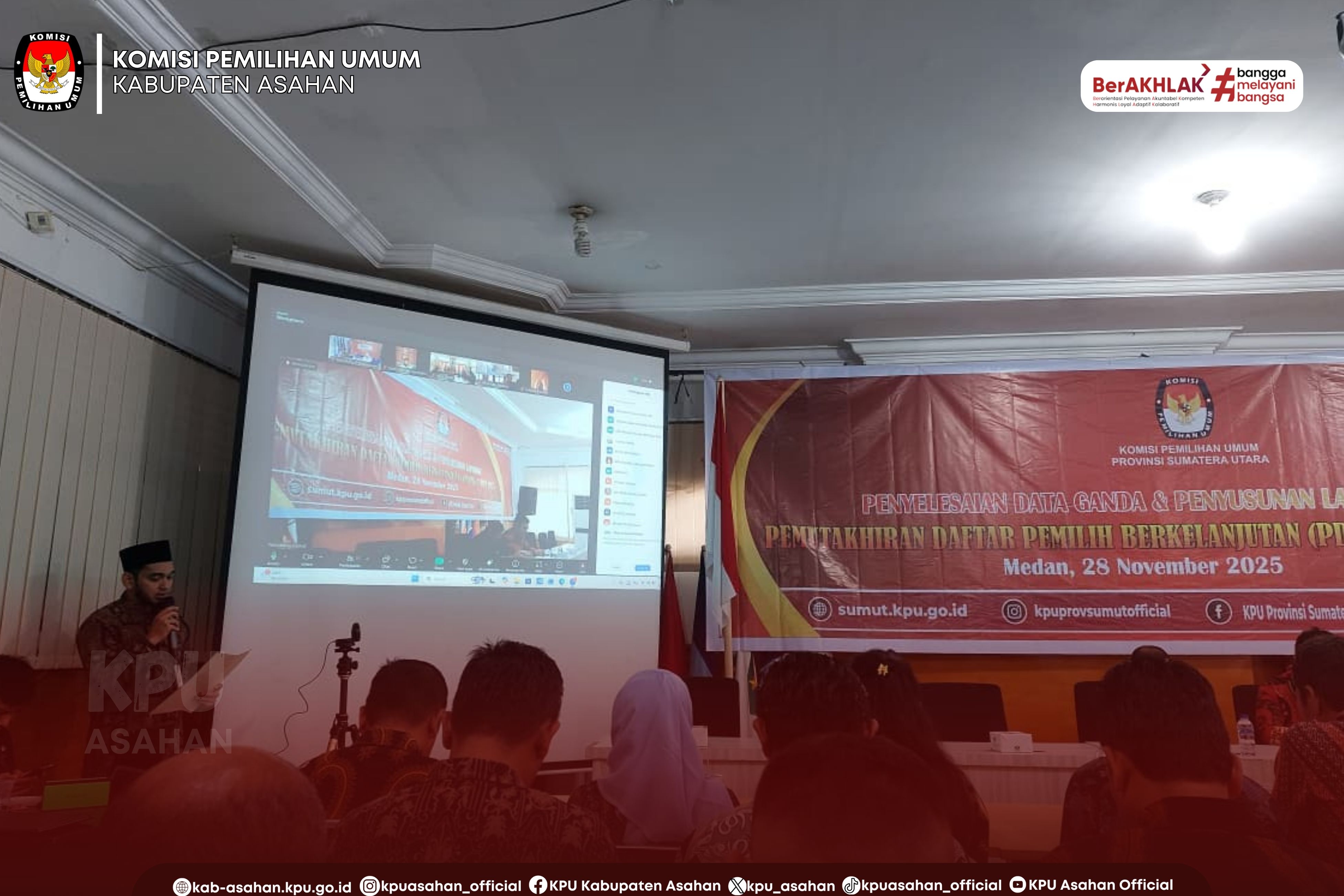 KPU Kabupaten Asahan Menghadiri Rapat Koordinasi Percepatan Penyelesaian Data Ganda dan Penyusunan Laporan Pemutakhiran Data Pemilih Berkelanjutan (PDPB) Semester II Tahun 2025 oleh KPU Provinsi Sumatera Utara, Jumat(28/11/25).