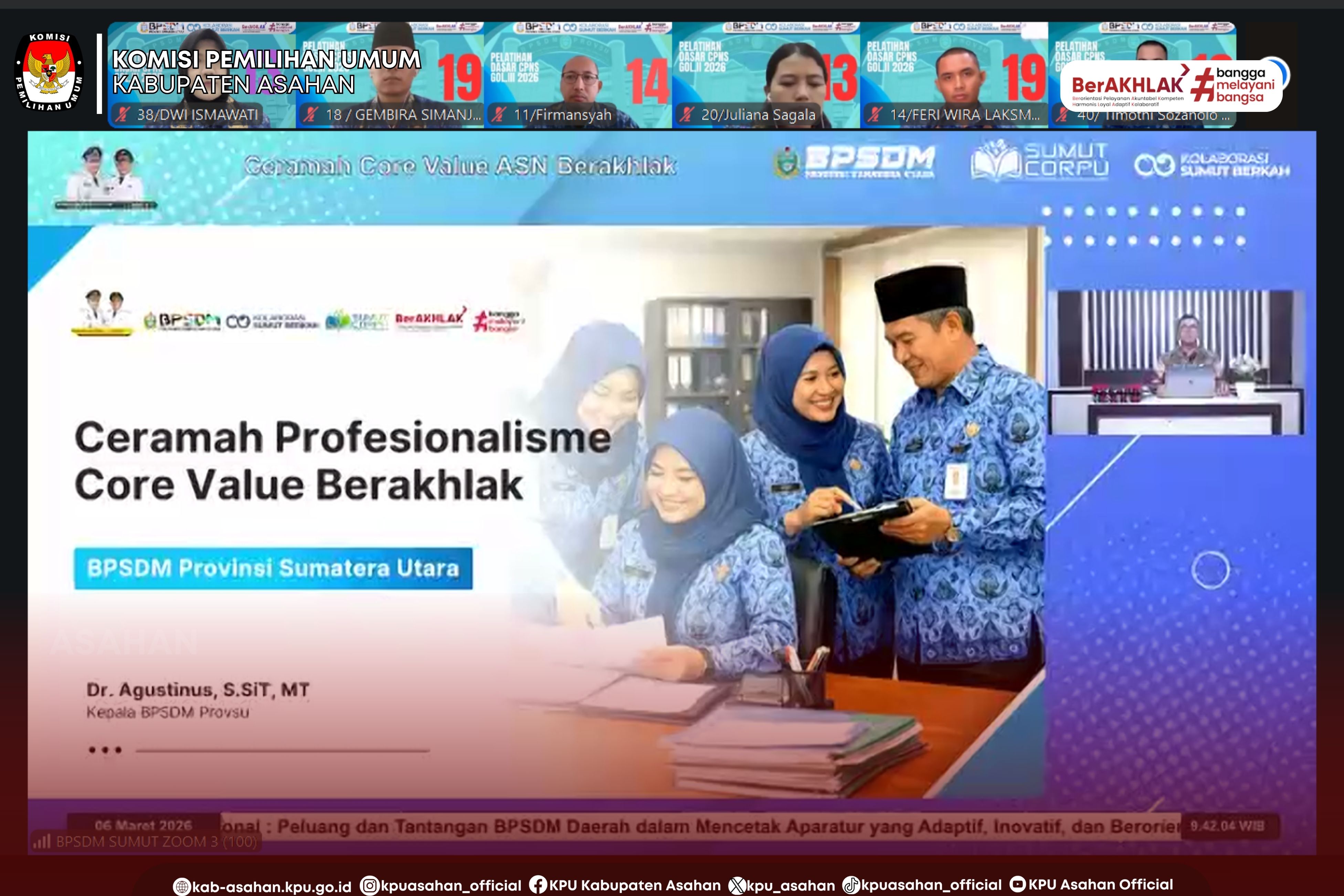 KPU Kabupaten Asahan mengikuti kegiatan Ceramah Profesionalisme Core Value BerAKHLAK yang diselenggarakan oleh BPSDM Provinsi Sumatera Utara melalui Zoom Meeting, Jumat (06/03/26).