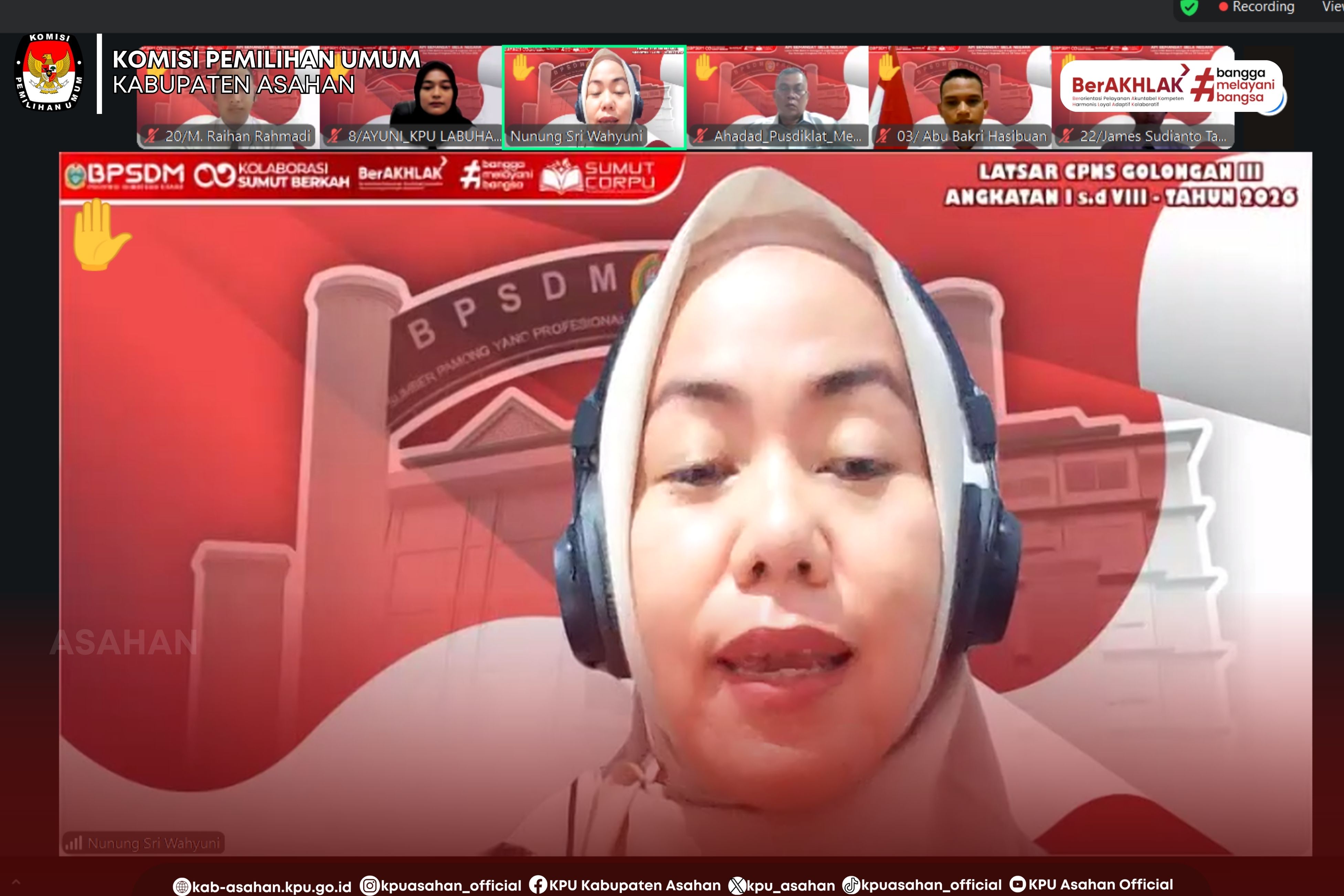 KPU Kabupaten Asahan turut ambil bagian dalam kegiatan Api Semangat Bela Negara (ASBN) pada Pelatihan Dasar CPNS Batch IV Golongan III Angkatan XIII s.d XVI secara daring melalui Zoom Meeting oleh BPSDM Sumut, Senin (09/03/26).