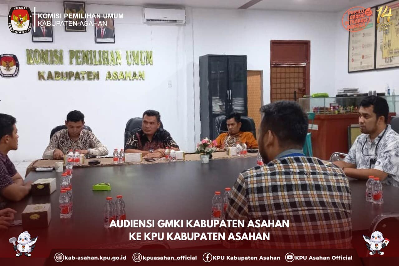 Audiensi diterima oleh Ketua KPU Asahan Hidayat, Anggota KPU Asahan DivisI Perencanaan, Data dan Informasi Kristian Santo Yoseph Sinulingga, Anggota KPU Asahan Divisi Teknis Penyelenggaraan Pangulu Siregar dan Kasubbag Teknis Penyelenggara Pemilu, Partisipasi dan Hubungan Masyarakat KPU Asahan Wiwin Azmi Harahap serta dihadiri oleh Ketua Demisioner GMKI Asahan Josua Lumban Tobing, Ketua Terpilih Krise Sitorus dan Sekretaris Terpilih GMKI Asahan Valentino Sihombing.