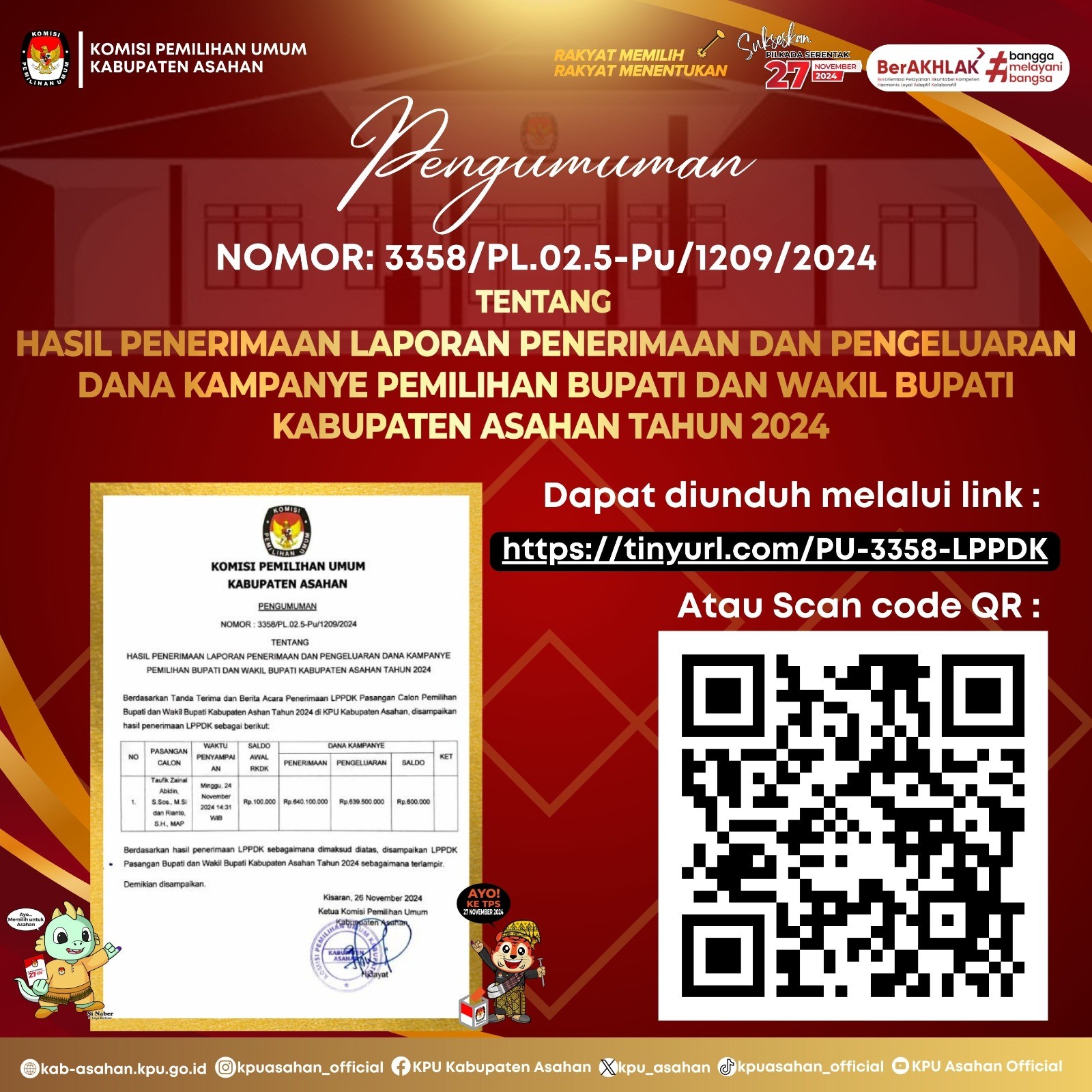Berikut ini disampaikan Hasil Penerimaan Laporan Penerimaan dan Pengeluaran Dana Kampanye Pemilihan Bupati dan Wakil Bupati Kabupaten Asahan Tahun 2024