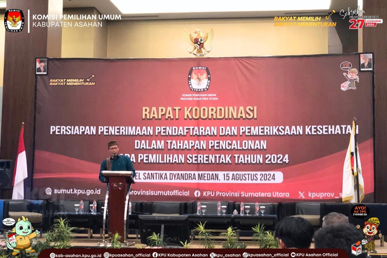 KPU Asahan menghadiri kegiatan Rapat Koordinasi Persiapan Penerimaan Pendaftaran dan Pemeriksaan Kesehatan Dalam Tahapan Pencalonan Pada Pemilihan Serentak Tahun 2024 bertempat di Hotel Santika Dyandra Medan, Kamis (15/08/24)