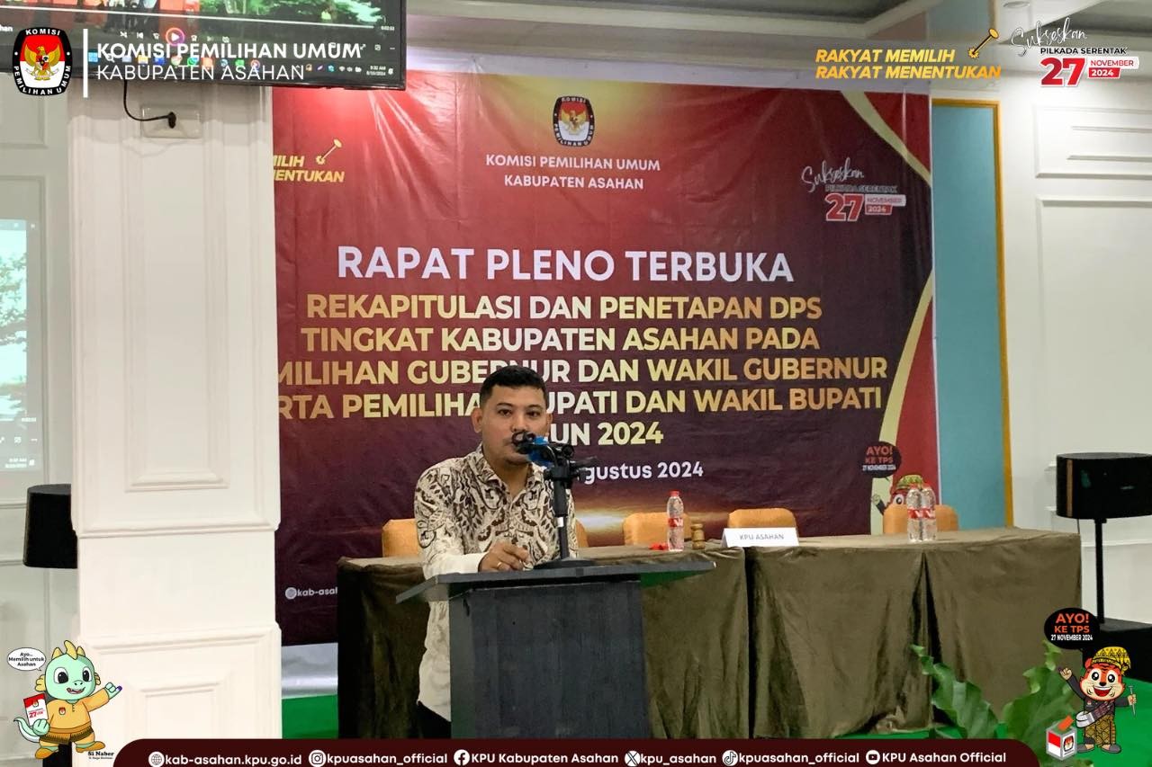 Dalam rapat pleno terbuka tersebut ditetapkan Daftar Pemilih Sementara (DPS) Tingkat Kabupaten Asahan Pada Pilkada Serentak Tahun 2024 berjumlah 558.603 pemilih, dengan rincian 278.519 orang laki-laki dan 280.074 orang perempuan yang tersebar di 1385 TPS pada 25 Kecamatan Se-Kabupaten Asahan.