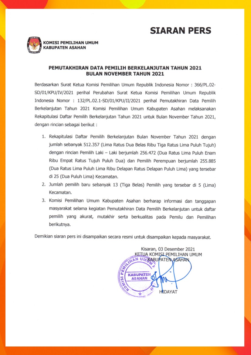 kab-asahan.kpu.go.id - KPU Kabupaten Asahan melaksanakan Rapat Pleno Rekapitulasi Daftar Pemilih berkelanjutan di tingkat Kabupaten Asahan periode November 2021. Berikut adalah Siaran Pers Pemutakhiran Data Pemilih Berkelanjutan Bulan November Tahun 2021.