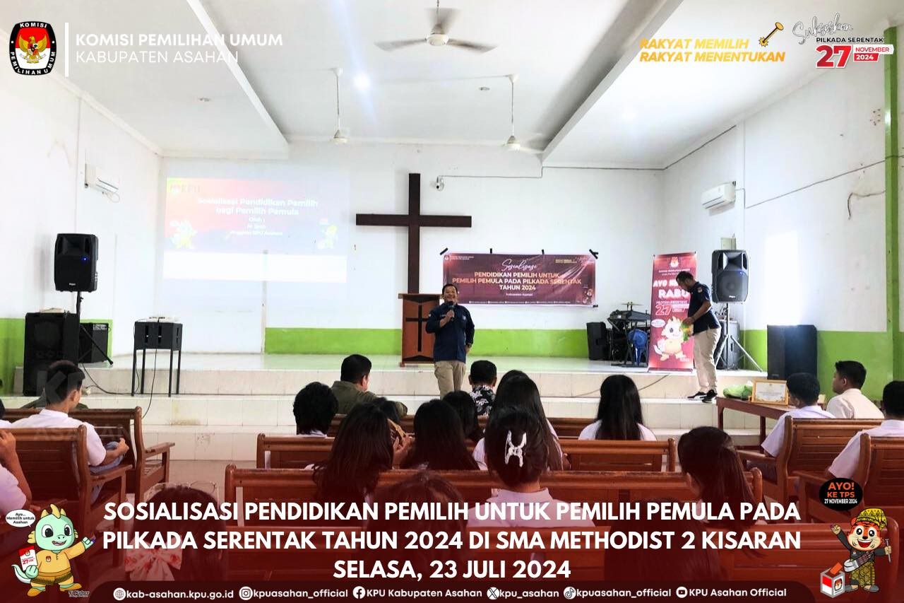 KPU Asahan melaksanakan Sosialisasi Pendidikan Pemilih Untuk Pemilih Pemula Pada Pilkada Serentak Tahun 2024 bertempat di SMA Swasta Methodist 2 Kisaran, Selasa (23/07/24)