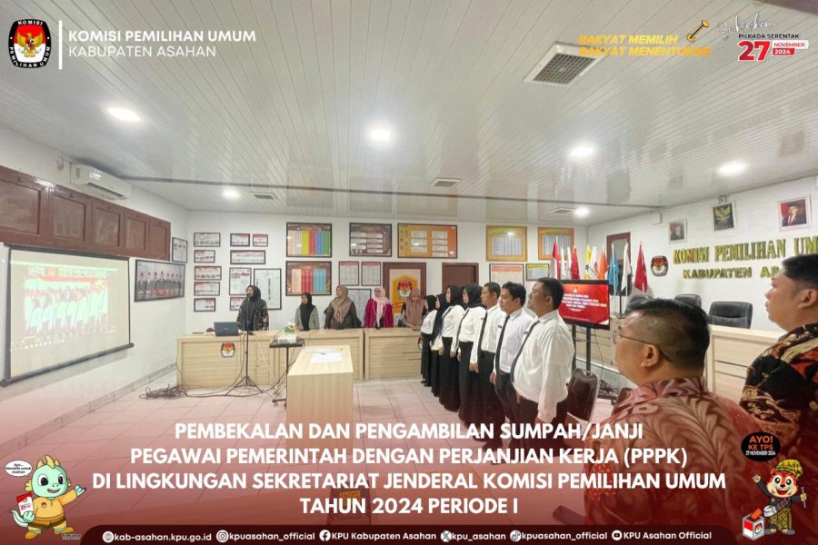 KPU Asahan menghadiri secara daring kegiatan Pembekalan dan Pengambilan Sumpah/Janji Pegawai Pemerintah dengan Perjanjian Kerja (PPPK) di Lingkungan Sekretariat Jenderal Komisi Pemilihan Umum Tahun 2024 Periode I bertempat di Aula Kantor KPU Asahan, Jum'at (23/05/25). Kegiatan ini dimulai pukul 08.00 WIB dan diawali dengan Pengarahan Umum oleh Kepala Biro SDM KPU. Selanjutnya, dilakukan pembekalan terhadap PPPK oleh Badan Kepegawaian Negara yang menyampaikan materi mengenai hak dan kewajiban PPPK. Pemaparan juga disampaikan oleh Kepala Bagian Kinerja dan Kesejahteraan KPU mengenai aspek kedisiplinan PPPK. Agenda kemudian dilanjutkan dengan pengambilan sumpah/janji PPPK oleh Sekretaris Jenderal KPU, Bapak Drs. Bernad Dermawan Sutrisno, M.Si., yang dilaksanakan secara luring di Kantor KPU RI dan daring oleh seluruh satuan kerja KPU Provinsi serta KPU Kabupaten/Kota se-Indonesia. Pada kesempatan ini, sebanyak 7 (tujuh) orang dari Sekretariat KPU Kabupaten Asahan resmi diangkat menjadi Pegawai Pemerintah dengan Perjanjian Kerja (PPPK). Adapun nama-namanya yaitu Dede Irma Suryani, Handri Wiranta, Chairul Ramadhana, Malasari, Rina Iriani, Ari Darmadi Rambe, dan Hetty Wulandary S. Pelantikan ini turut dihadiri oleh Ketua KPU Asahan, Hidayat, Anggota KPU Asahan Divisi SDM, Sosialisasi Pendidikan Pemilih dan Partisipasi Masyarakat, M. Syah, Anggota KPU Asahan Divisi Hukum dan Pengawasan, Nurasli Napitupulu, dan Sekretaris KPU Asahan, Ery Dermawan didampingi Para Kasubbag serta Jajaran Staf Sekretariat KPU Asahan dan para PPPK yang dilantik pada hari ini.