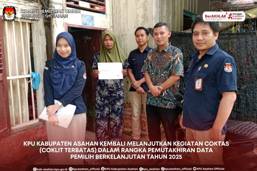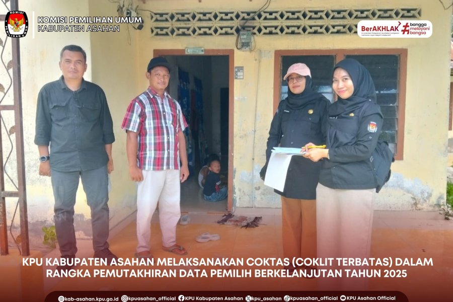 KPU Kabupaten Asahan kembali melaksanakan kegiatan Coktas (Coklit Terbatas) dalam rangka PDPB Tahun 2025, Senin (24/11/25). Tim yang ditugaskan dalam kegiatan Coktas ini adalah Kadiv Perencanaan, Data, dan Informasi KPU Kabupaten Asahan Kristian Santo Yosefh Sinulingga beserta staf Perencanaan, Data, dan Informasi KPU Kabupaten Asahan. KPU Kabupaten Asahan terus memastikan keakuratan data pemilih melalui kegiatan Coktas yang dilakukan secara bertahap di seluruh wilayah. Kali ini tim yang bertugas melakukan Coktas di dua kecamatan yaitu Kecamatan Buntu Pane dan Kecamatan Setia Janji. Dalam proses ini, petugas melakukan konfirmasi langsung kepada warga maupun pihak keluarga untuk memvalidasi setiap data yang tercatat termasuk memastikan status pemilih yang masih hidup agar tidak terjadi kesalahan dalam daftar pemilih tetap. Pendekatan dengan metode pintu ke pintu ini menjadi langkah penting agar tidak ada data pemilih yang terlewat atau tidak sesuai dengan kondisi faktual di lapangan. Melalui kegiatan Coktas ini, KPU Kabupaten Asahan berprinsip untuk terus menjaga integritas dan kualitas data pemilih untuk pemilihan periode selanjutnya. Akurasi data menjadi kunci utama dalam menjamin hak pilih masyarakat berjalan baik, tertib, dan sesuai ketentuan yang berlaku.
