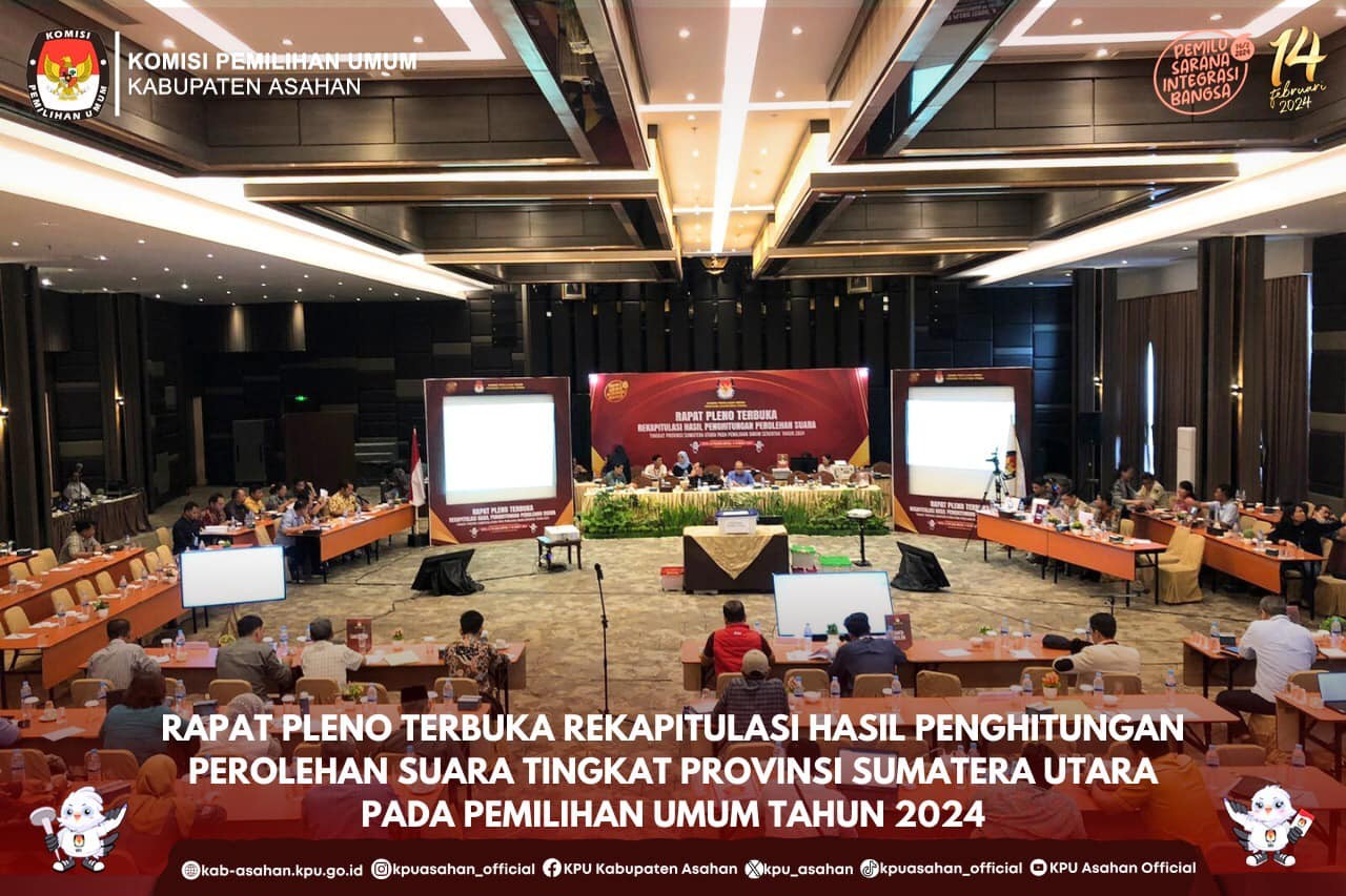 KPU Asahan melaksanakan Rapat Pleno Rekapitulasi dan Penetapan Rekapitulasi Hasil Penghitungan Perolehan Suara Tingkat Kabupaten Asahan Pada Pemilihan Umum Tahun 2024 bertempat di Hotel Antariksa Kisaran, Rabu 28 Februari 2024 s.d Senin 4 Maret 2024. Pelaksanaan Rapat Pleno Rekapitulasi ini merupakan tahap terakhir dalam tahapan Pemilu tahun 2024 yang dilaksanakan secara berjenjang, baik mulai dari kecamatan yang diselenggarakan oleh Panitia Pemilihan Kecamatan (PPK), lalu tingkat Kabupaten oleh KPU Kabupaten Asahan hingga nanti ke tingkat nasional oleh KPU RI. Pada tingkat Kabupaten Asahan dilaksanakan rekapitulasi pada Jenis Pemilihan PPWP, DPR, DPD, DPRD Provinsi Sumatera Utara dan DPRD Kabupaten Asahan dibacakan secara berurutan oleh masing-masing Panitia Pemilihan Kecamatan. Setelah proses rekapitulasi penghitungan suara selesai, dilaksanakan pencermatan hasil rekapitulasi bersama Bawaslu Asahan dan saksi yang hadir, kemudian dilanjutkan penandatangan oleh KPU Asahan dan semua saksi yang hadir pada D-Hasil Kabupaten dan ditutup dengan pembagian D-Hasil Kabupaten yang telah ditetapkan oleh KPU Asahan kepada Bawaslu Asahan dan saksi-saksi. Kegiatan ini dihadiri oleh Ketua dan Anggota KPU Asahan, Sekretaris dan Jajaran Sekretariat KPU Asahan, Bawaslu Asahan, Saksi Pasangan Calon Presiden dan Wakil Presiden, Saksi Partai Politik Peserta Pemilu dan Saksi Calon Anggota DPD Peserta Pemilu Tingkat Kabupaten Asahan, Pemantau Pemilu serta Panitia Pemilihan Se-Kabupaten Asahan. Pada pelaksanaan pembukaan turut dihadiri Pemerintah Kabupaten Asahan, Kapolres Asahan. Dandim 0208, Kejaksaan Negeri Asahan dan Pengadilan Negeri Kisaran.