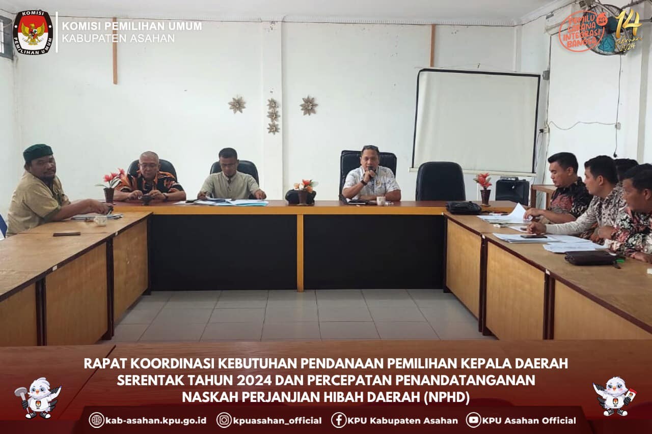 KPU Asahan menghadiri kegiatan Rapat Koordinasi Kebutuhan Pendanaan Pemilihan Kepala Daerah Serentak Tahun 2024 dan Percepatan Penandatanganan Naskah Perjanjian Hibah Daerah (NPHD) di Aula Kantor Badan Kesatuan Bangsa dan Politik Kabupaten Asahan, Jum'at (17/11/23).