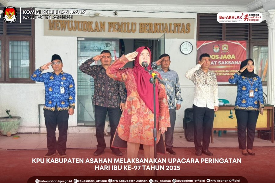KPU Kabupaten Asahan melaksanakan Upacara Peringatan Hari Ibu ke-97 Tahun 2025, Senin (22/12/25). Upacara ini dilaksanakan di halaman kantor KPU Kabupaten Asahan dan bertindak sebagai Inspektur Upacara, Anggota KPU Kabupaten Asahan Nurasli Napitupulu yang disertai oleh Ketua KPU Kabupaten Asahan Hidayat, Anggota KPU Kabupaten Asahan Kristian Santo Yosefh Sinulingga dan M.Syah. Turut hadir pula Sekretaris KPU Kabupaten Asahan Ery Dermawan. Berlaku sebagai Komandan Upacara yaitu Kasubbag Keuangan, Umum dan Logistik KPU Kabupaten Asahan, H.P.Harahap yang diikuti oleh seluruh jajaran Kasubbag KPU Kabupaten Asahan beserta seluruh staf KPU Kabupaten Asahan. Upacara yang berlangsung dengan khidmat dan penuh makna ini dilaksanakan sebagai wujud penghormatan dan apresiasi kepada seluruh perempuan Indonesia, khususnya para ibu atas peran dan kontribusinya dalam keluarga, masyarakat, dan bangsa. Peringatan Hari Ibu menjadi momentum pengingat akan nilai-nilai keteladanan, pengabdian, dan semangat juang perempuan terus relevan dalam setiap aspek kehidupan berbangsa dan bernegara. Melalui momentum ini, KPU Kabupaten Asahan terus mendukung partisipasi aktif perempuan dalam demokrasi, baik sebagai penyelenggara, peserta, maupun pemilih. Keterlibatan perempuan merupakan bagian penting dalam mewujudkan pemilu yang inklusif, berintegritas, dan berkualitas. KPU Kabupaten Asahan melaksanakan Upacara Peringatan Hari Ibu ke-97 Tahun 2025, Senin (22/12/25). Upacara ini dilaksanakan di halaman kantor KPU Kabupaten Asahan dan bertindak sebagai Inspektur Upacara, Anggota KPU Kabupaten Asahan Nurasli Napitupulu yang disertai oleh Ketua KPU Kabupaten Asahan Hidayat, Anggota KPU Kabupaten Asahan Kristian Santo Yosefh Sinulingga dan M.Syah. Turut hadir pula Sekretaris KPU Kabupaten Asahan Ery Dermawan. Berlaku sebagai Komandan Upacara yaitu Kasubbag Keuangan, Umum dan Logistik KPU Kabupaten Asahan, H.P.Harahap yang diikuti oleh seluruh jajaran Kasubbag KPU Kabupaten Asahan beserta seluruh staf KPU Kabupaten Asahan. Upacara yang berlangsung dengan khidmat dan penuh makna ini dilaksanakan sebagai wujud penghormatan dan apresiasi kepada seluruh perempuan Indonesia, khususnya para ibu atas peran dan kontribusinya dalam keluarga, masyarakat, dan bangsa. Peringatan Hari Ibu menjadi momentum pengingat akan nilai-nilai keteladanan, pengabdian, dan semangat juang perempuan terus relevan dalam setiap aspek kehidupan berbangsa dan bernegara. Melalui momentum ini, KPU Kabupaten Asahan terus mendukung partisipasi aktif perempuan dalam demokrasi, baik sebagai penyelenggara, peserta, maupun pemilih. Keterlibatan perempuan merupakan bagian penting dalam mewujudkan pemilu yang inklusif, berintegritas, dan berkualitas.