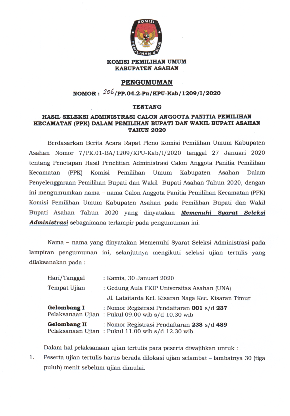 Sesuai Pengumuman KPU Asahan Nomor : 320/PP.04.2-Pu/1209/KPU-Kab/II/2020 Tentang Seleksi Calon Anggota Panitia Pemungutan Suara (PPS) Pada Pemilihan Bupati dan Wakil Bupati Asahan Tahun 2020 bahwa proses Penerimaan Pendaftaran PPS mulai dari Tanggal 18 Februari 2020 sampai dengan 24 Februari 2020.