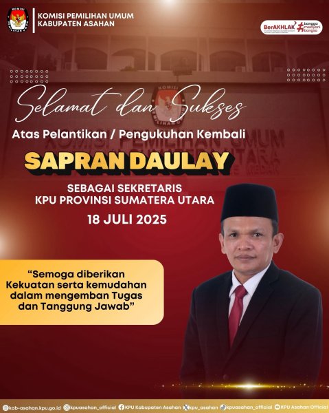 Komisi Pemilihan Umum Kabupaten Asahan Kembali melaksanakan Pemberian santunan beserta doa bersama anak yatim di Aula Kantor KPU Kabupaten Asahan, Jumat (25/07/2025). Kegiatan yang dilaksanakan oleh Komisi Pemilihan Umum secara serentak se-Indonesia ini dilakukan dalam rangka bentuk Kepedulian Komisi Pemilihan Umum terhadap generasi bangsa dan untuk memperat tali silaturahmi serta meningkatkan solidaritas antar sesama manusia. Acara ini dibuka langsung oleh Ketua KPU Kabupaten Asahan, Hidayat yang didampingi oleh Anggota KPU Kabupaten Asahan, M.Syah, dan Sekretaris KPU Kabupaten Asahan, Ery Dermawan beserta Kasubbag dan Staff Sekretariat KPU Kabupaten Asahan. Dalam sambutannya, Ketua KPU Kabupaten Asahan menyampaikan kegiatan ini sebagai bentuk kepedulian KPU dengan sesama, kiranya santunan yang diberikan dapat diterima, dipergunakan dan di manfaatkan dengan baik oleh anak-anak yatim penerima tersebut. Acara ditutup dengan kegiatan pemberian santunan dan foto bersama dengan anak-anak yatim.