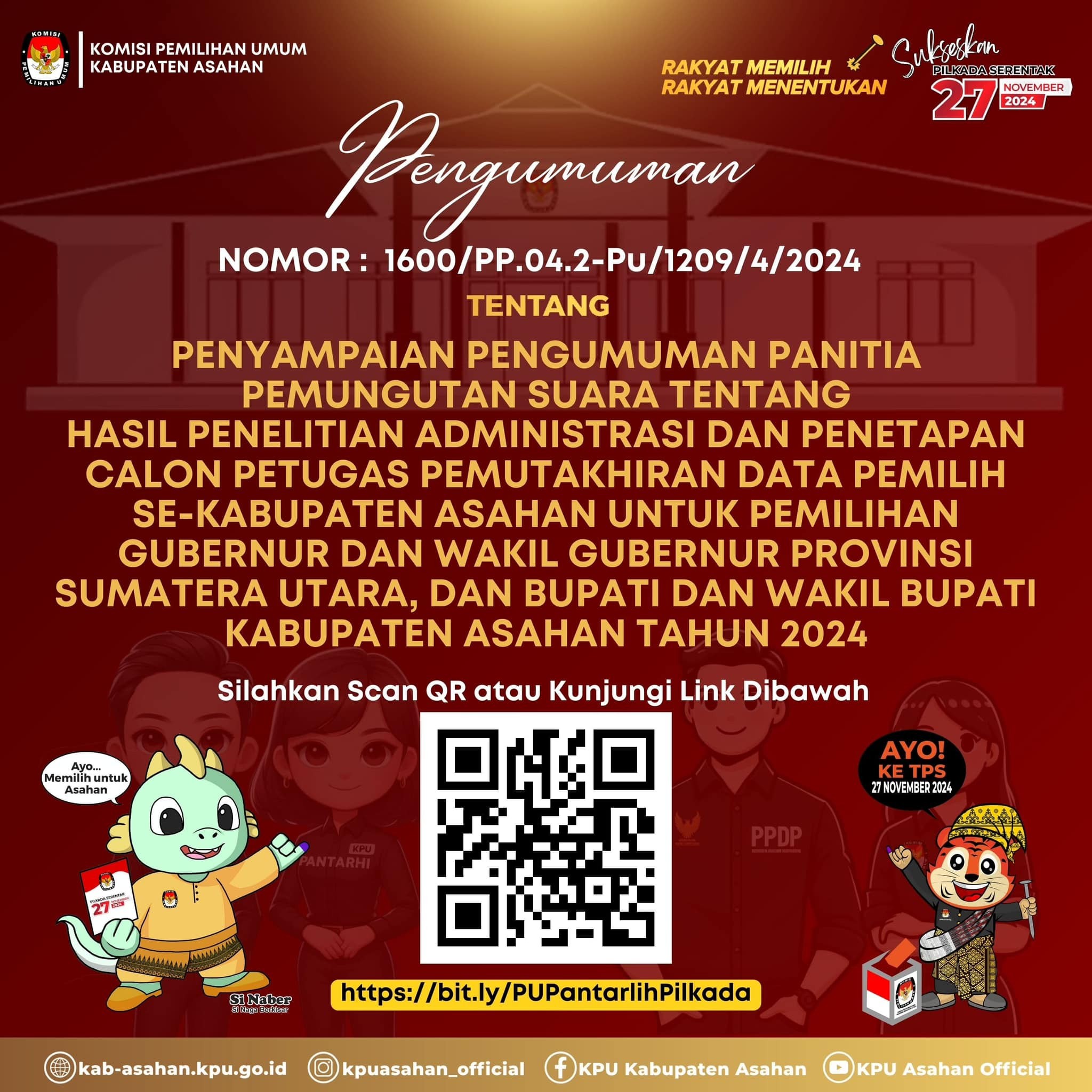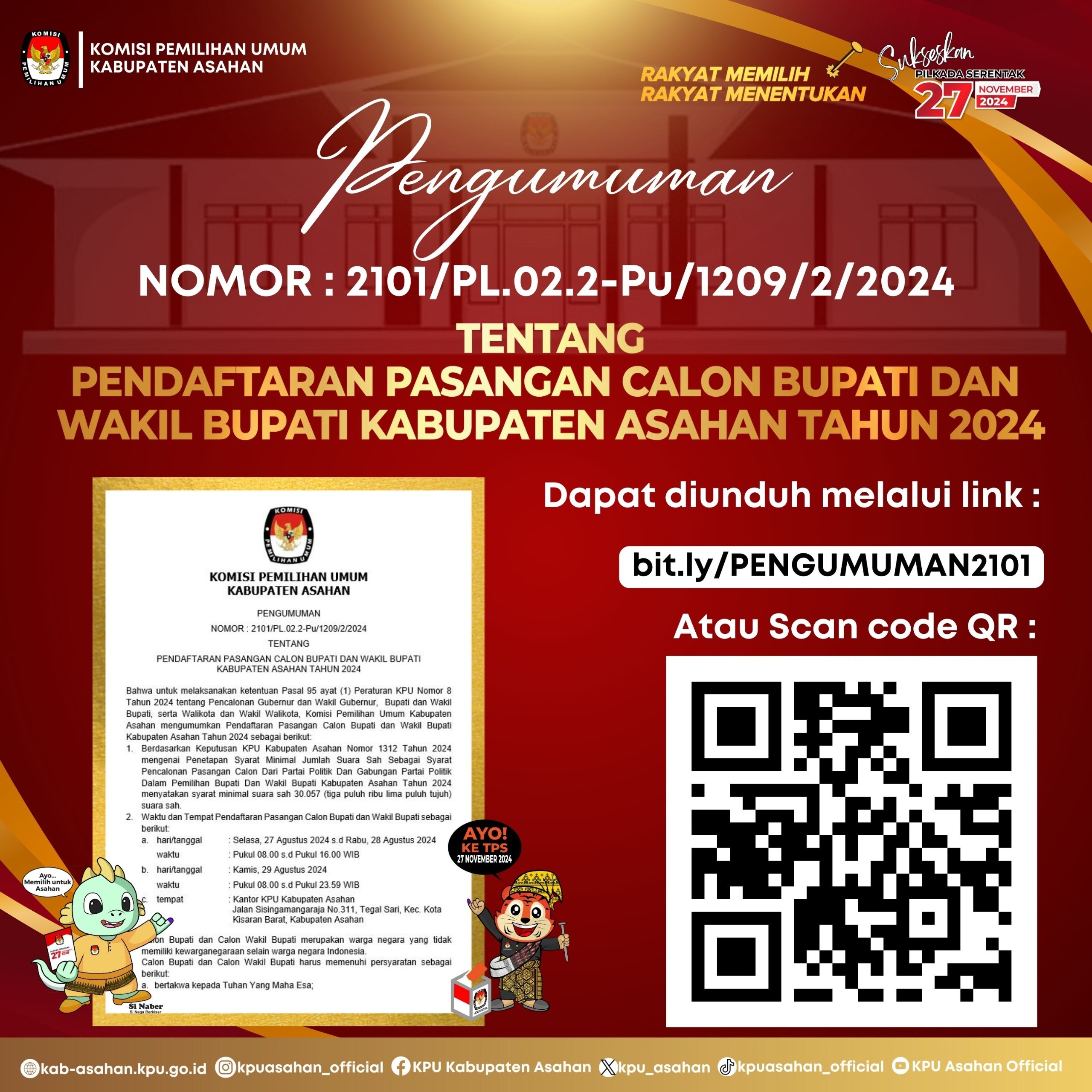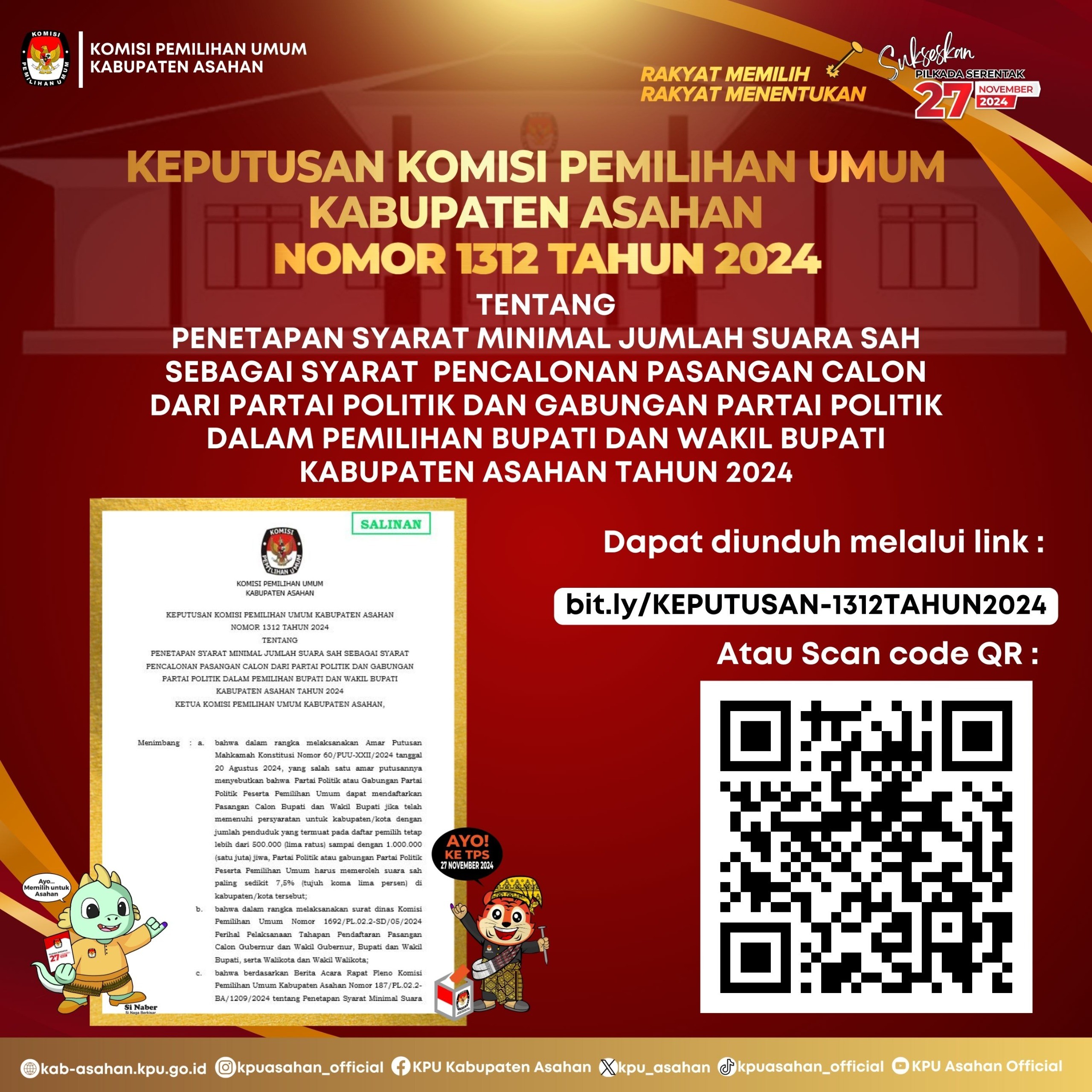 #TemanPemilih, Berikut kami sampaikan Keputusan Komisi Pemilihan Umum Kabupaten Asahan Nomor 1312 Tahun 2024 tentang Penetapan Syarat Minimal Jumlah Suara Sah sebagai Syarat Pencalonan Pasangan Calon dari Partai Politik dan Gabungan Partai Politik Dalam Pemilihan Bupati dan Wakil Bupati Kabupaten Asahan Tahun 2024.